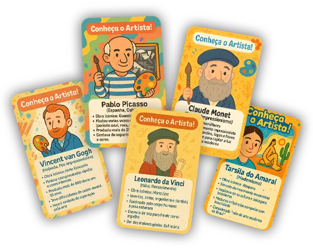 Cartões ilustrados com informações rápidas e curiosas sobre os grandes nomes da arte. Ideal para usar como jogo, consulta ou exposição em casa ou na sala de aula.