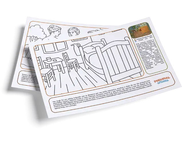 São mais de 60 desenhos exclusivos para colorir, explorar e se encantar com os maiores nomes da história da arte — como Van Gogh, Da Vinci, Picasso, Monet, e muito mais.